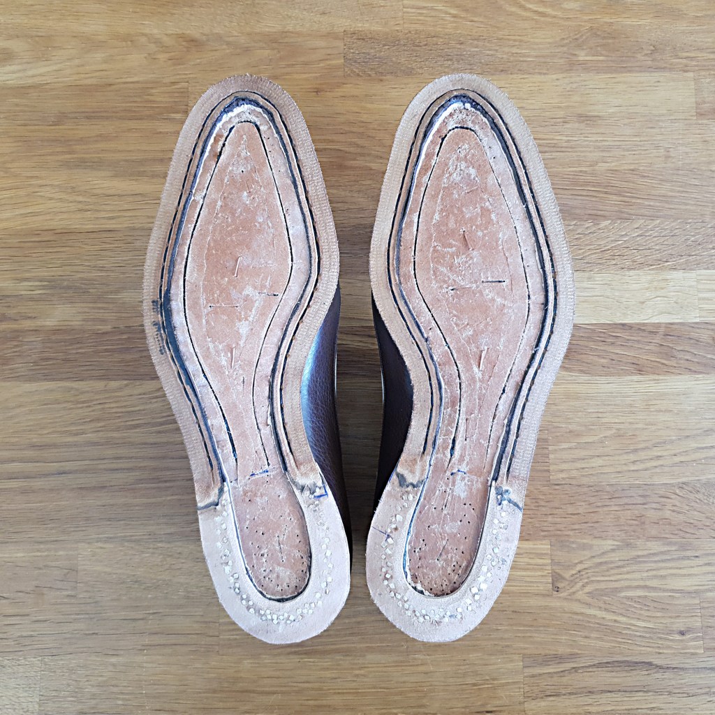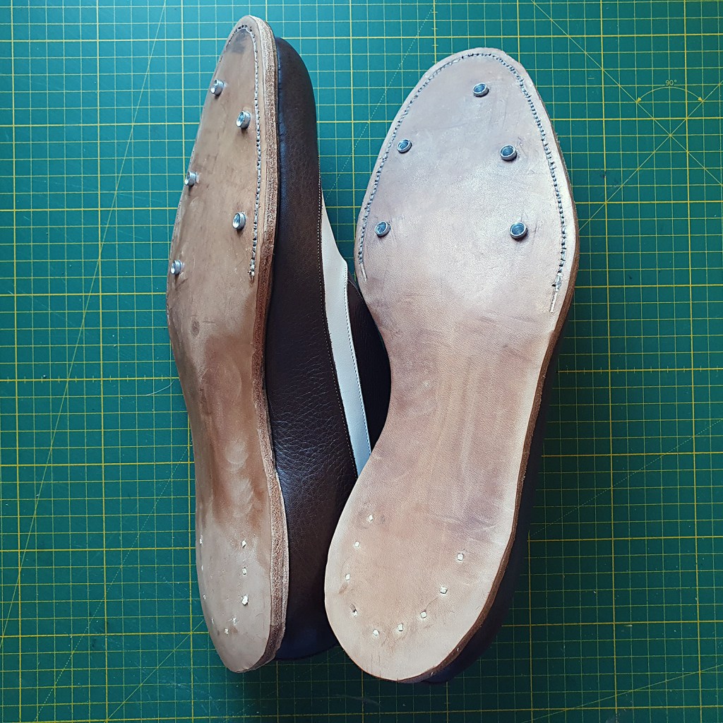 The upper leather used is Italian; brown 4 oz madras calf and white 3-4 oz aniline calf. (The uppers were closed ca four months ago, and now I regret not using premium shoe leather.) The shanks were covered in Tärnsjö leather, and the footbeds were filled with a layer of tar felt. I think the slightly odd pattern works, all tied together with green beading leather. Here I’m ready to cement the outsoles on:
