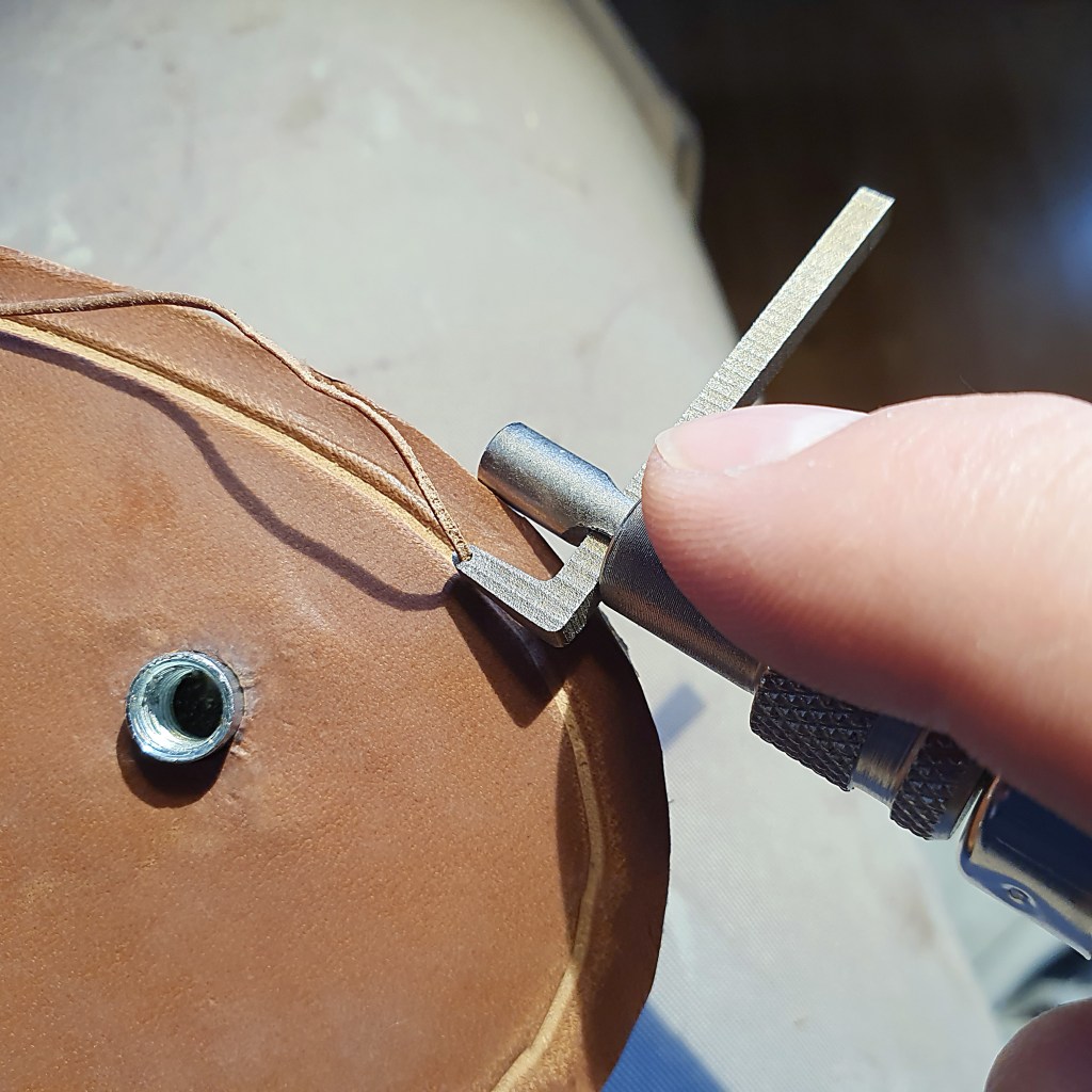 I used this kind of tool (dunno what it’s called?) to create a channel for the outsole stitch. Three laps did the trick.