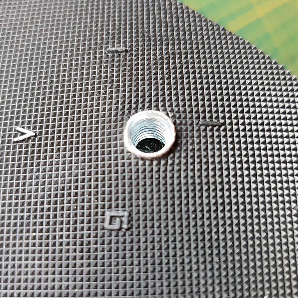 The fit around the protruding t-nut parts was rather snug. I used a plastic bone folder to really tuck the rubber tight against the t-nuts. (I started using a real bonefolder, but the plastic one could get in there even tighter, and didn’t risk chipping in the process.) I guess I could have gone up a girth with the hole punch, but the result was satisfactory.