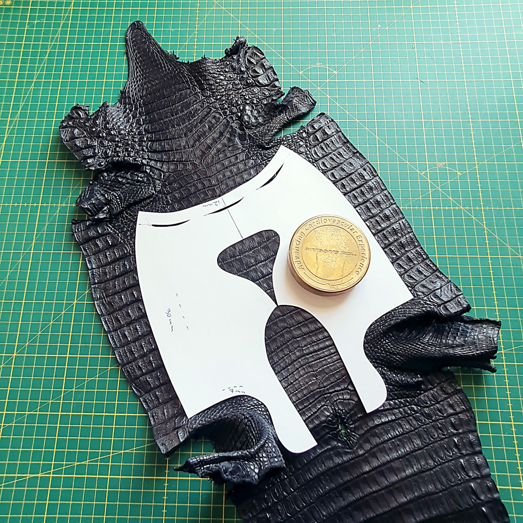 I aligned the pattern trying to center the piece as evenly as possible with the structure of the hide. I used the opening of the shoe and the center line of the pattern at the front to take aim. Since the shoes will have cap toes overlapping the front of the vamp, I opted to keep a full row of scales at the top of the vamp, towards the face. This row of scales will hence remain intact, whereas the scales at the front will be cut off by the toe cap anyway.