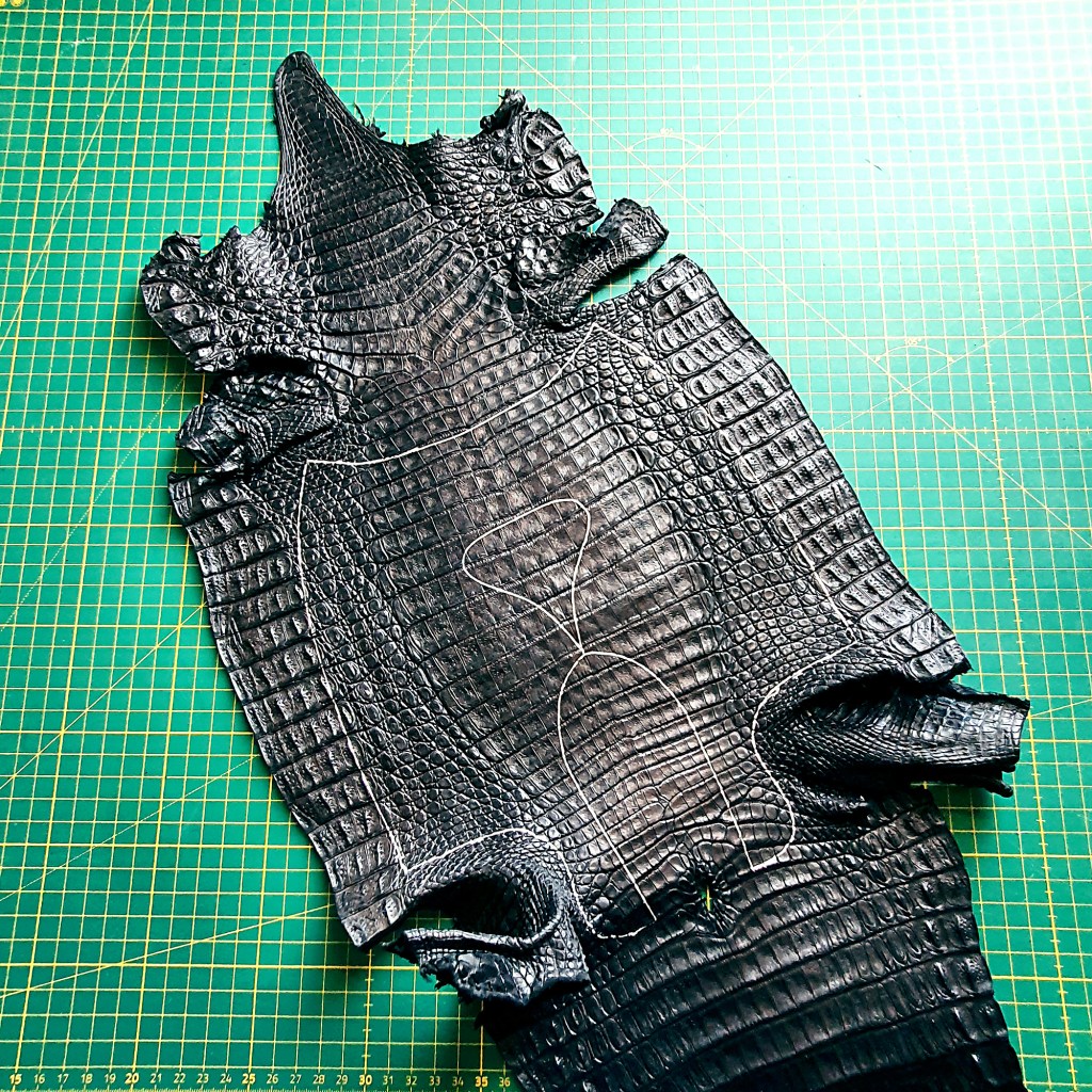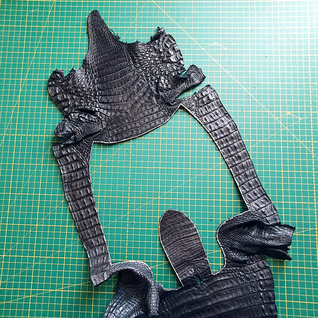Caiman leather is partly very hard, through ossification in some parts of the hide. There are thin pieces of bone inside the larger scales, making them rigid. At the back part of the caiman (which is along the edges of the hide, since it was cut open at the back), the ossification has formed little horns of sorts. The smaller scales, between the horned back and the belly, and around the legs, have no ossification in them at all. These parts instead have a great deal of stretch – far more so than box calf.