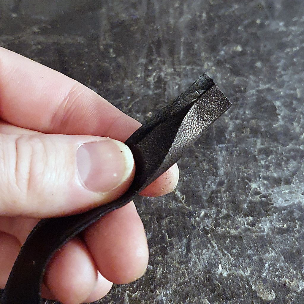 I made beading to decorate the opening of the shoe, by cutting out a strip of thin leather and cementing it shut like shown below. Once completely folded, I hammer it to get a nice and even surface, cut up slits all around it so that it will bend naturally around the opening, and insert it inside the uppers.