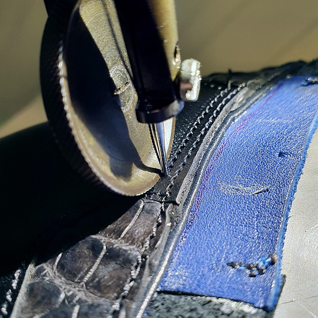 Sewing through the caiman leather was easier than I had ancipated, what with the ossification. It was nothing my good ol’ Pfaff 593 (heavy duty post bed) couldn’t handle – it cut through the caiman like butter, bones and all.