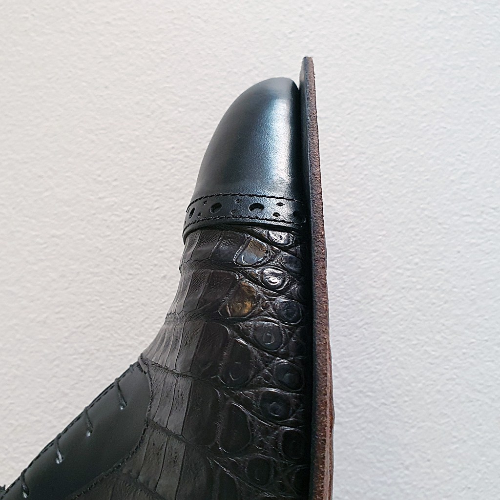 I’ve imported some caiman hides with the appropriate CITES certificate, Appendix II. I made this shoe into an adelaide design for practical reasons, having the main part of the shoe made out of caiman leather.