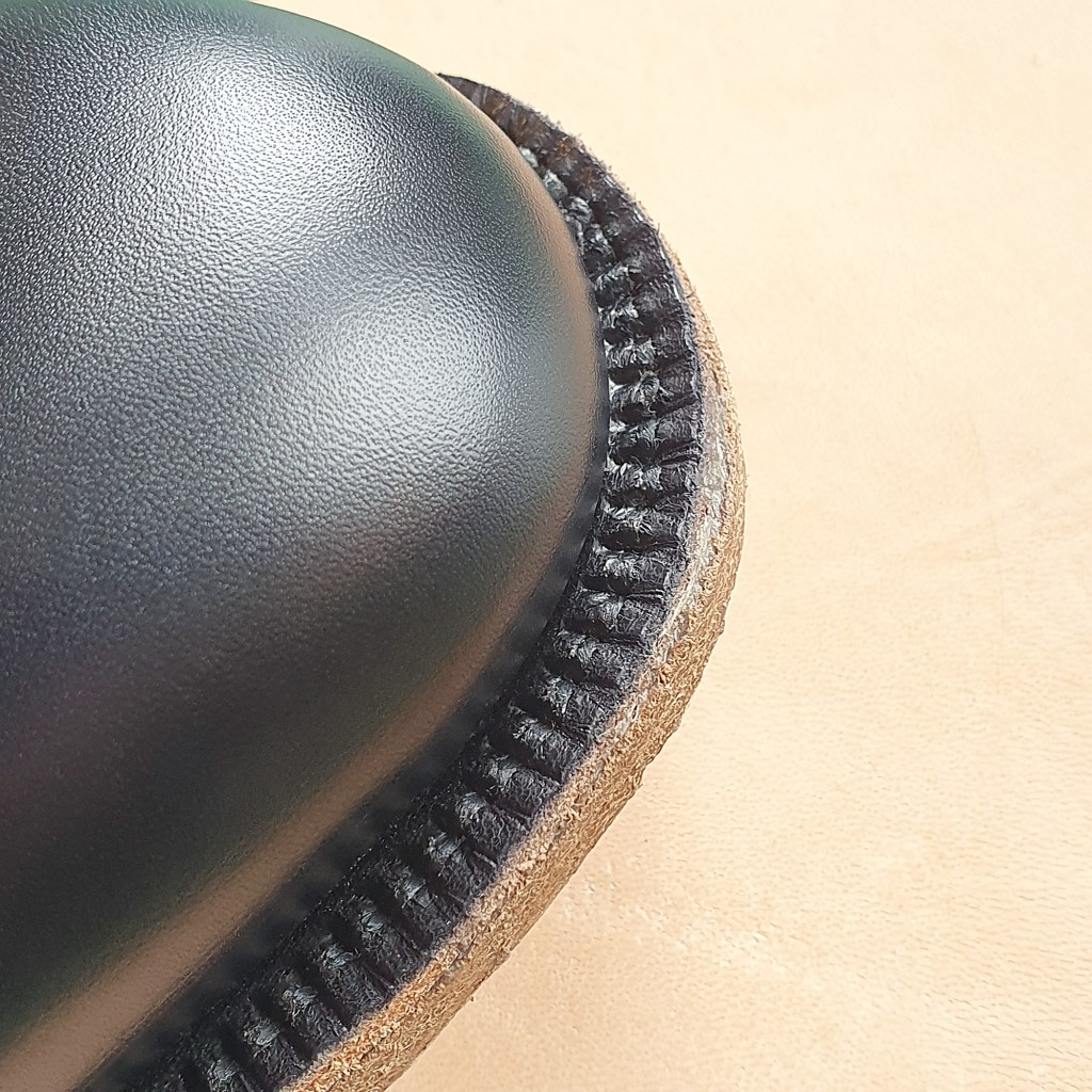 I put on some oak bark tanned outsoles by Tannerie Garat, which was a real pleasure to work with. The thread used is 0.035″ waxed polycord in black, by the Maine Thread Co.