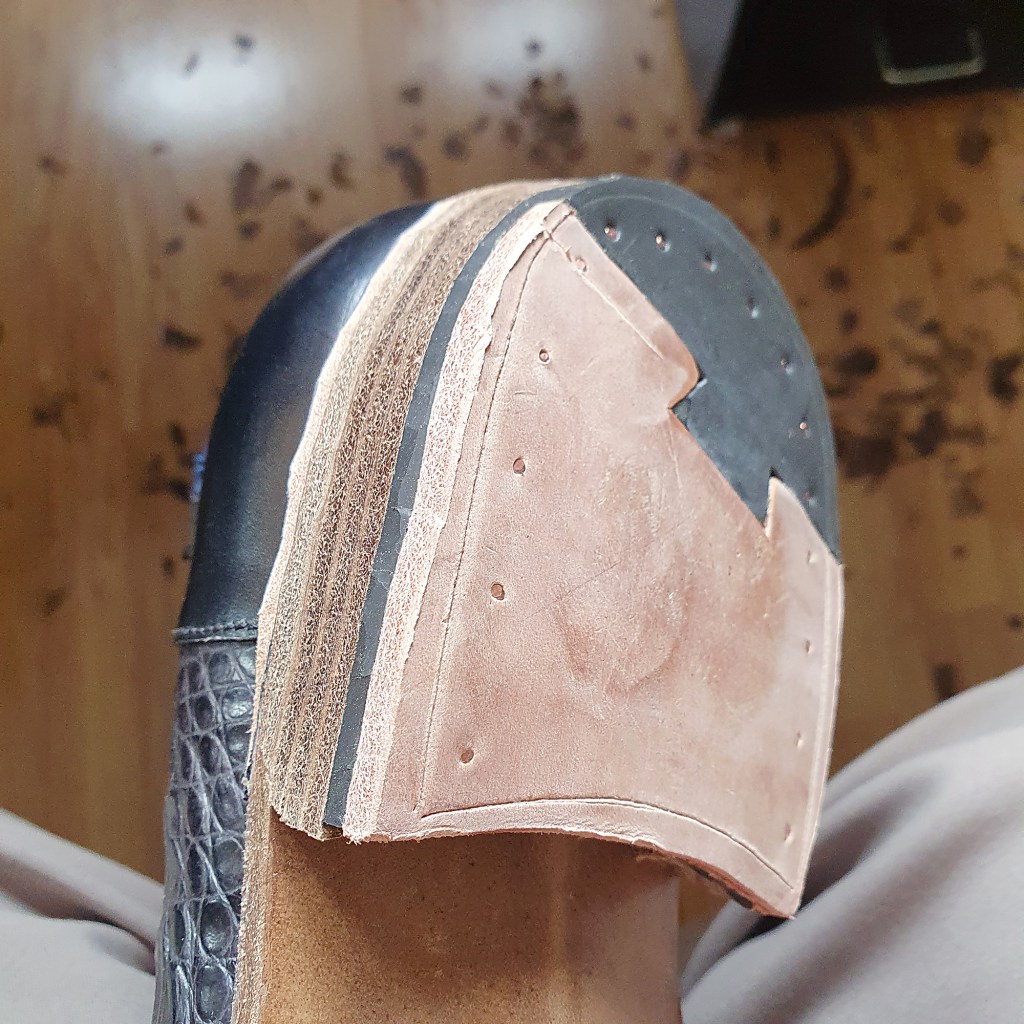 I made a very thin strap of black leather and put behind the broguing of the toe caps, so that the inside of the brogue holes wouldn’t be disturbed by the uneven texture of the caiman.