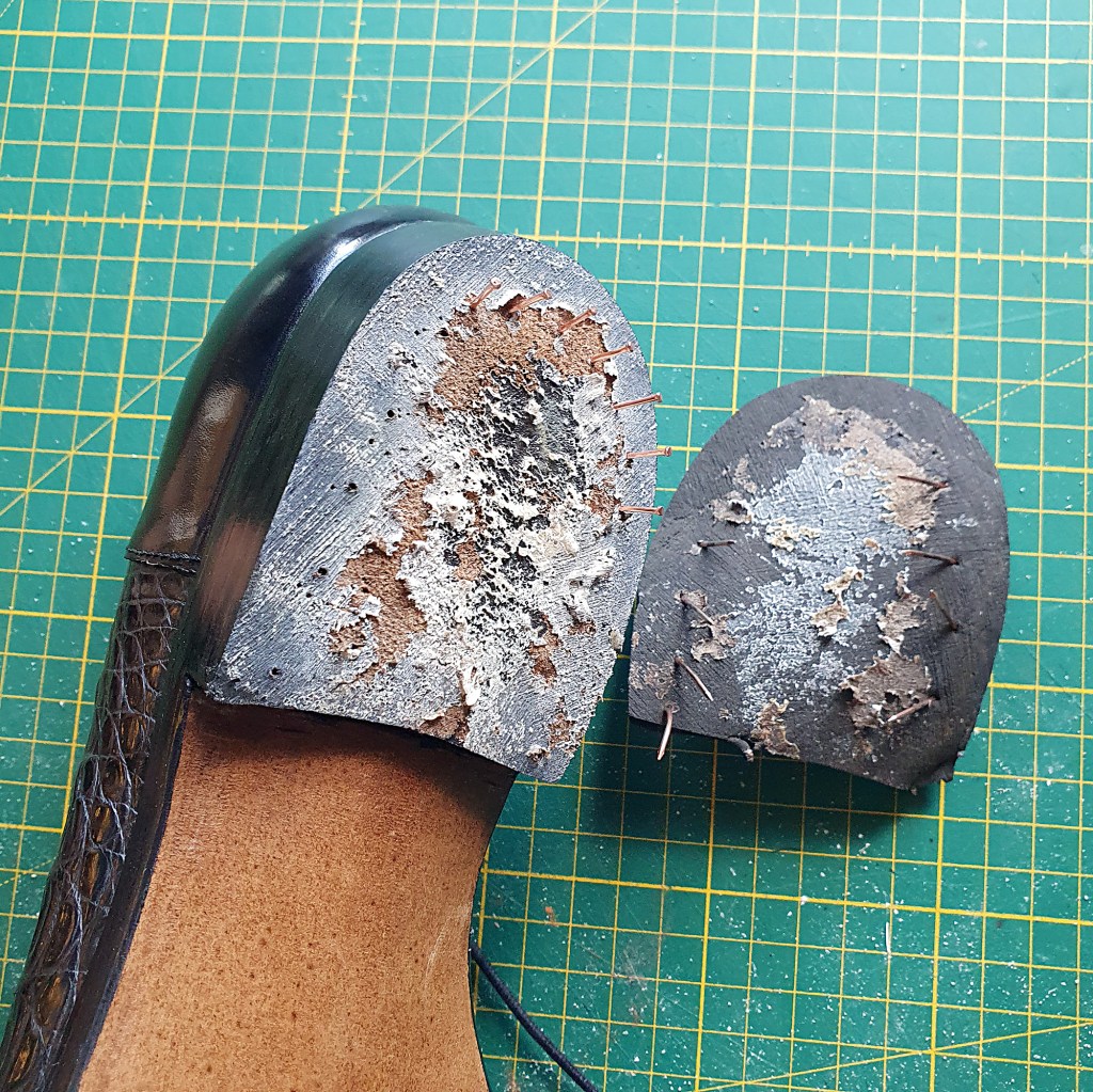 When I originally made the heels, I had secured the top lifts with copper plated lastning nails, going through the heel stacks. I find this does a great job of holding everything together. As such, getting the lifts off required some time and a bit of brute force, but I eventually made it.